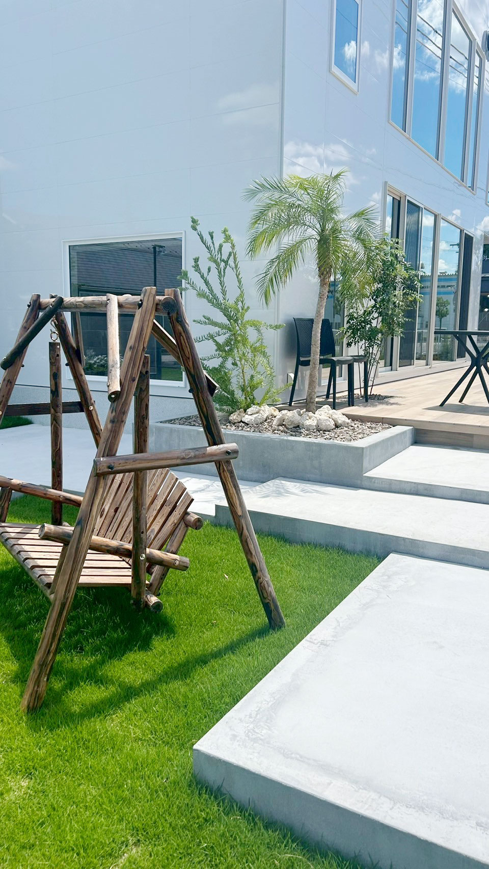 芝生の緑と素材のコントラストが映える、開放感のある景観です。