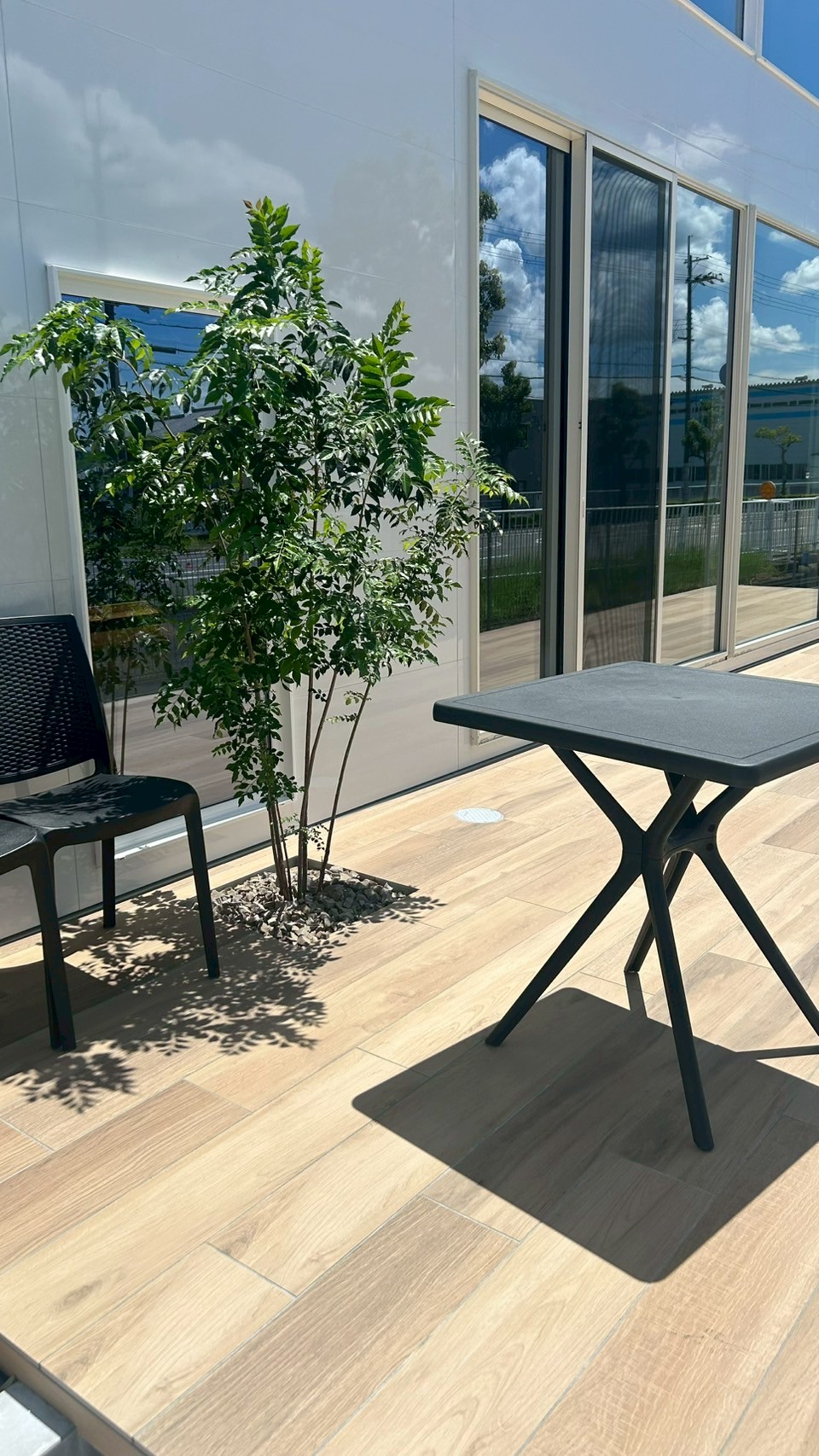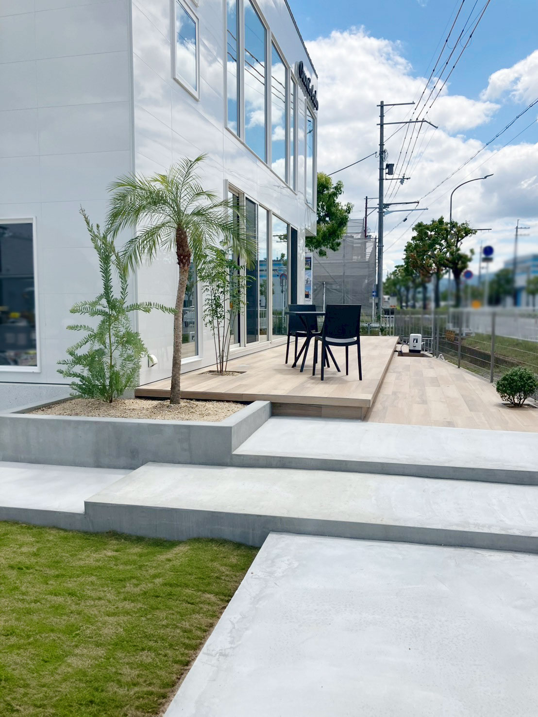 芝生エリアには木目調のステップ、住宅へは大きめのコンクリート土間を採用し、